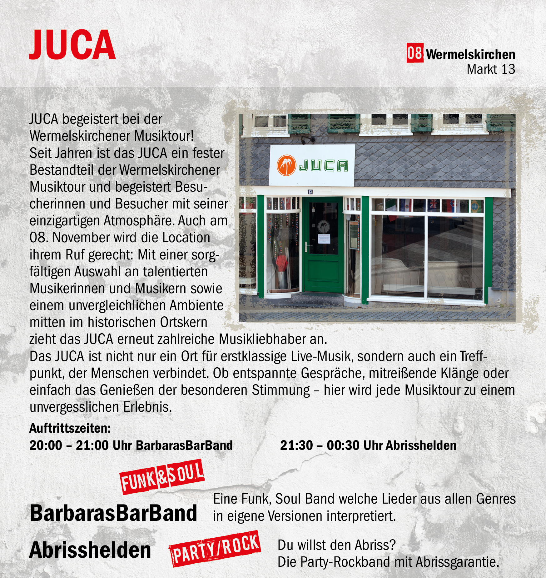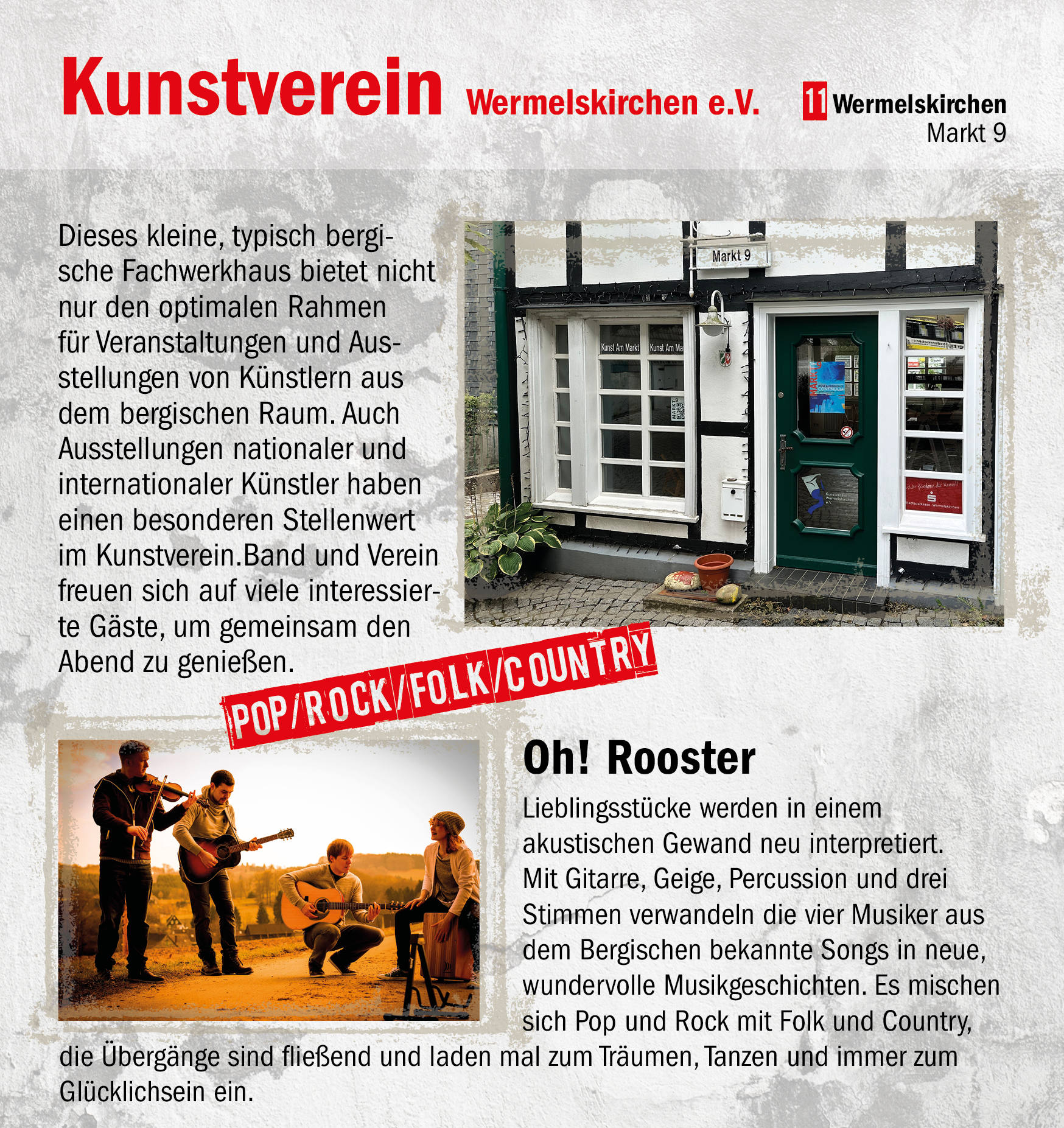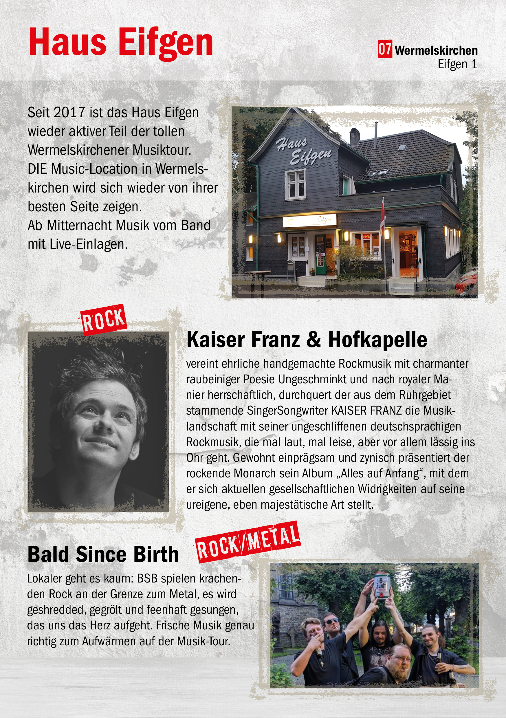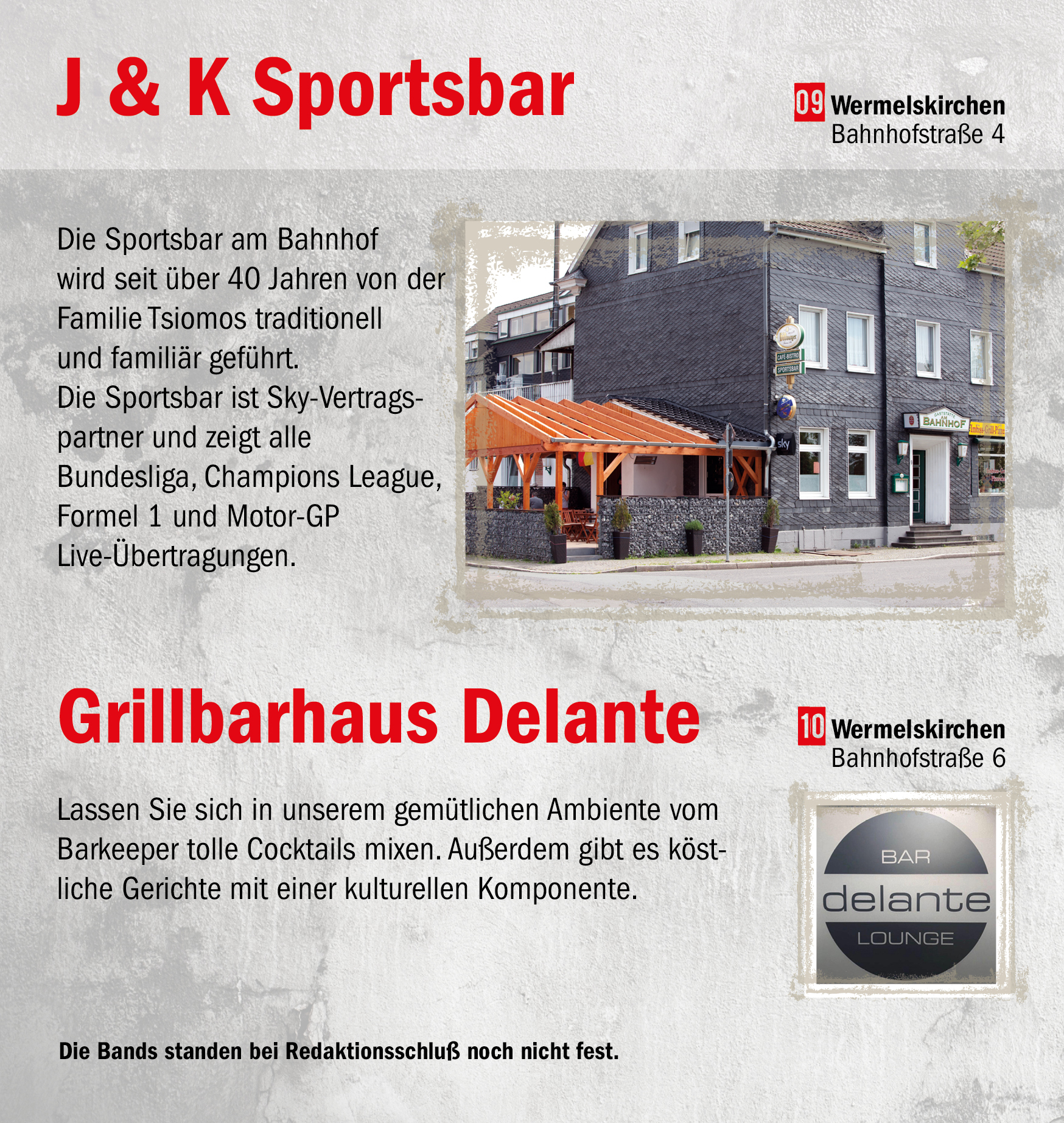 AJZ Bahndamm (Sonic Beat Explosion, Supercobra, Deviltrain), Bistro Katt (Bratsche), Centrale (Virus), CVJM (Mixtape 65), Das süße Leben (Jeanne Altfeld, Tuma), Gaststätte Höller (DJ Nameless), Haus Eifgen (Kaiser Franz & Hofkapelle, Bald Since Birth), JUCA (BarbarasBarBand, Abrisshelden), J & K Sportsbar/Grillbarhaus Delante, Kunstverein (Oh! Rooster), Restaurant Balkan (Party-Colonias 2.0), Restaurant Dimitra (Griechisches Duo), Toskana (WEMusik), Trattoria Capriccio, Dorfkultur (The Hamples, Chum Bucket), Markt 57 (Vom Fass), Zur Post (Nobbi)
