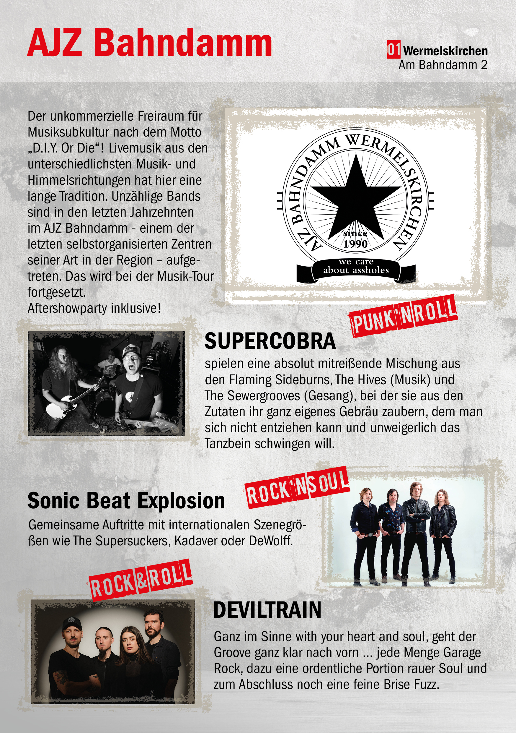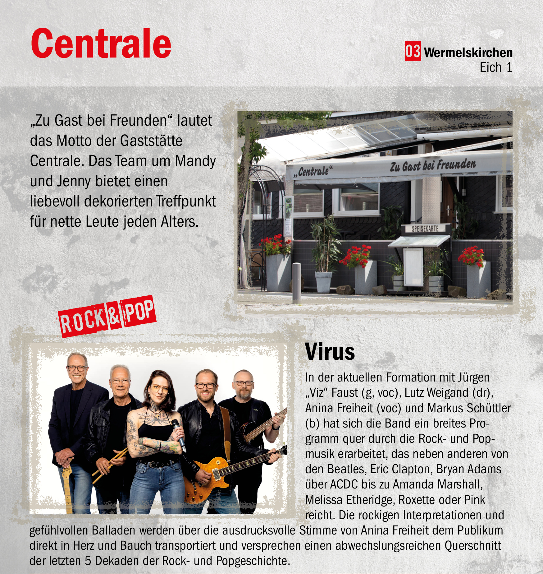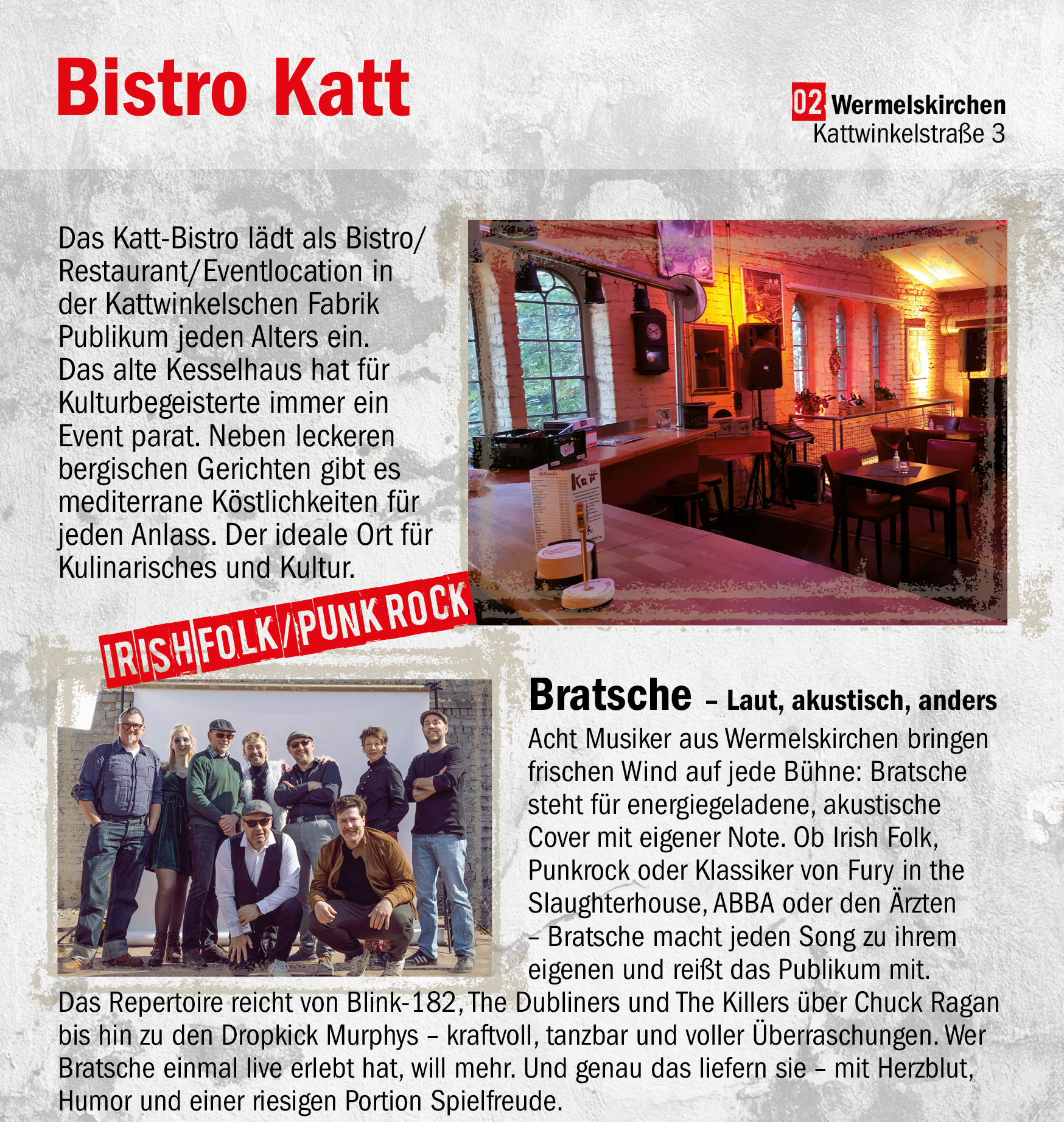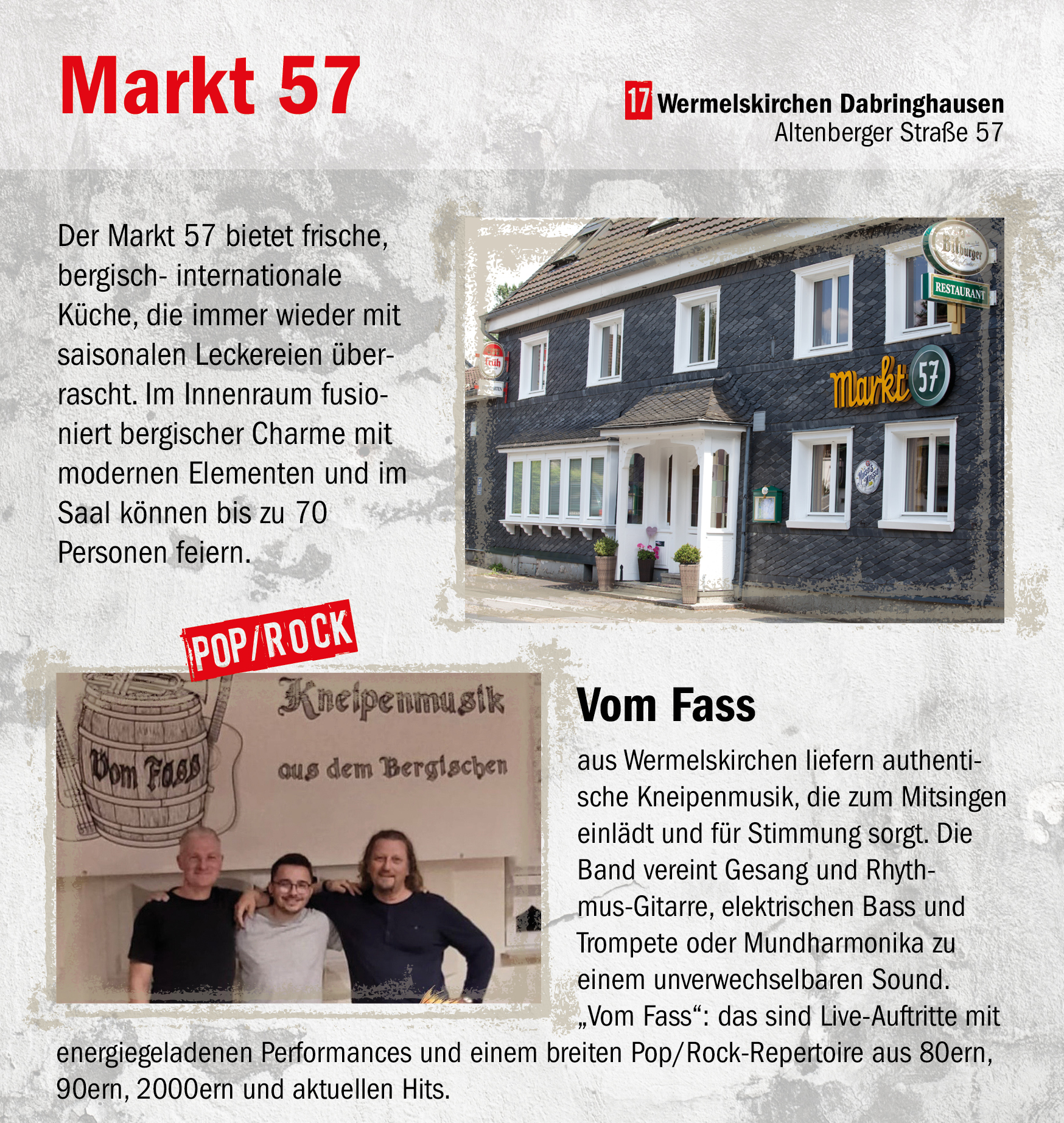 AJZ Bahndamm (Sonic Beat Explosion, Supercobra, Deviltrain), Bistro Katt (Bratsche), Centrale (Virus), CVJM (Mixtape 65), Das süße Leben (Jeanne Altfeld, Tuma), Gaststätte Höller (DJ Nameless), Haus Eifgen (Kaiser Franz & Hofkapelle, Bald Since Birth), JUCA (BarbarasBarBand, Abrisshelden), J & K Sportsbar/Grillbarhaus Delante, Kunstverein (Oh! Rooster), Restaurant Balkan (Party-Colonias 2.0), Restaurant Dimitra (Griechisches Duo), Toskana (WEMusik), Trattoria Capriccio, Dorfkultur (The Hamples, Chum Bucket), Markt 57 (Vom Fass), Zur Post (Nobbi)