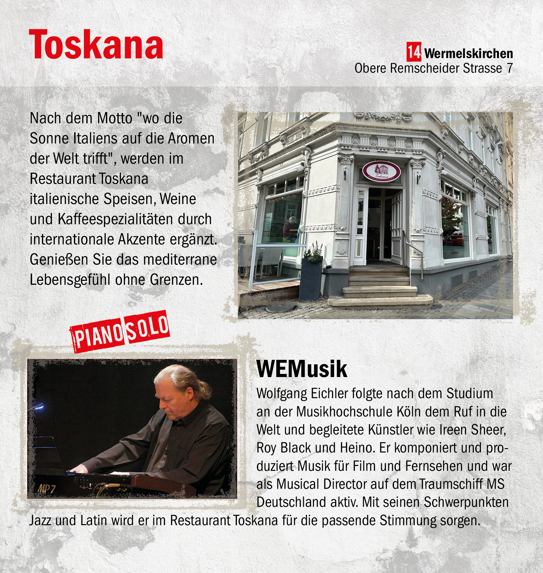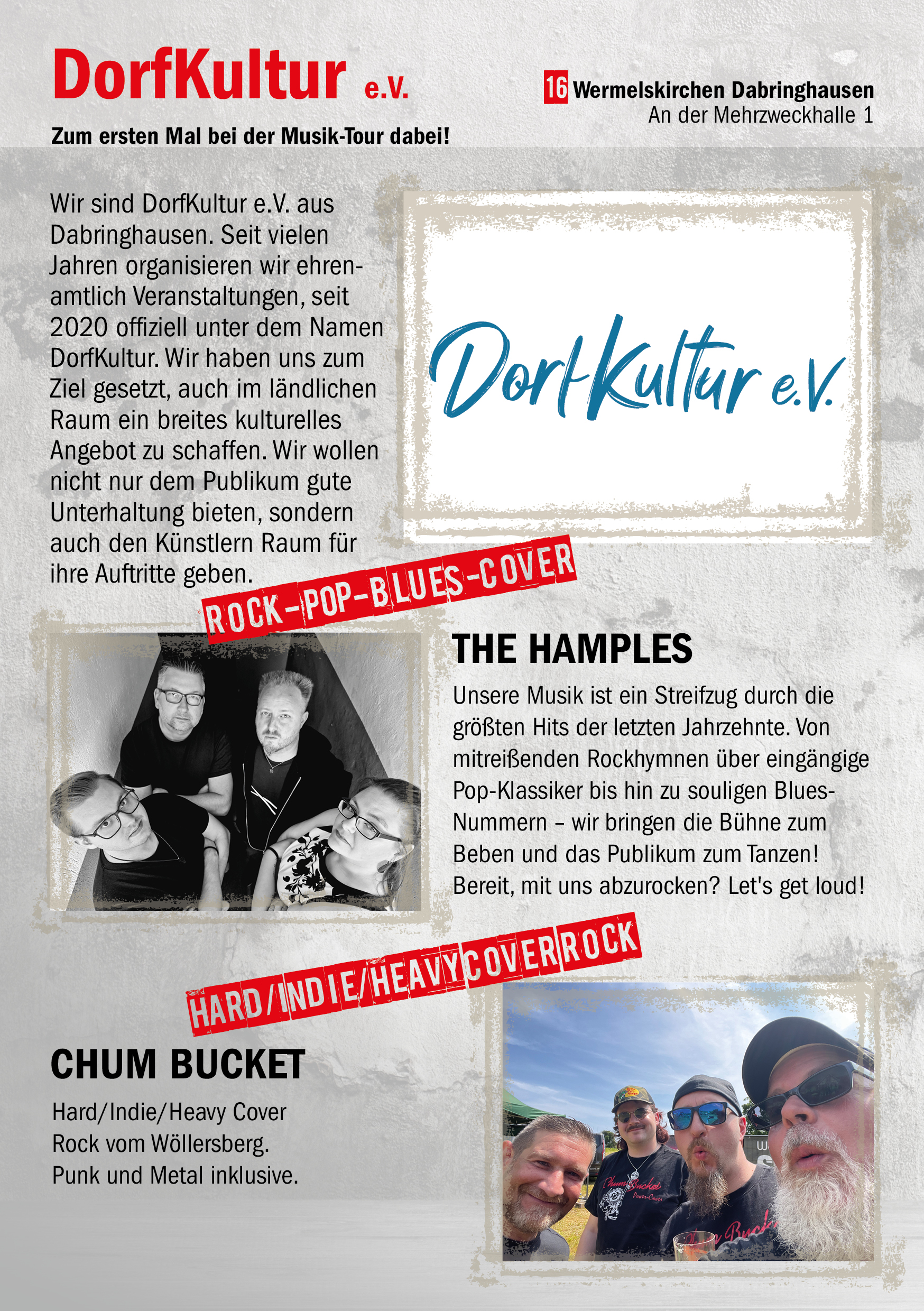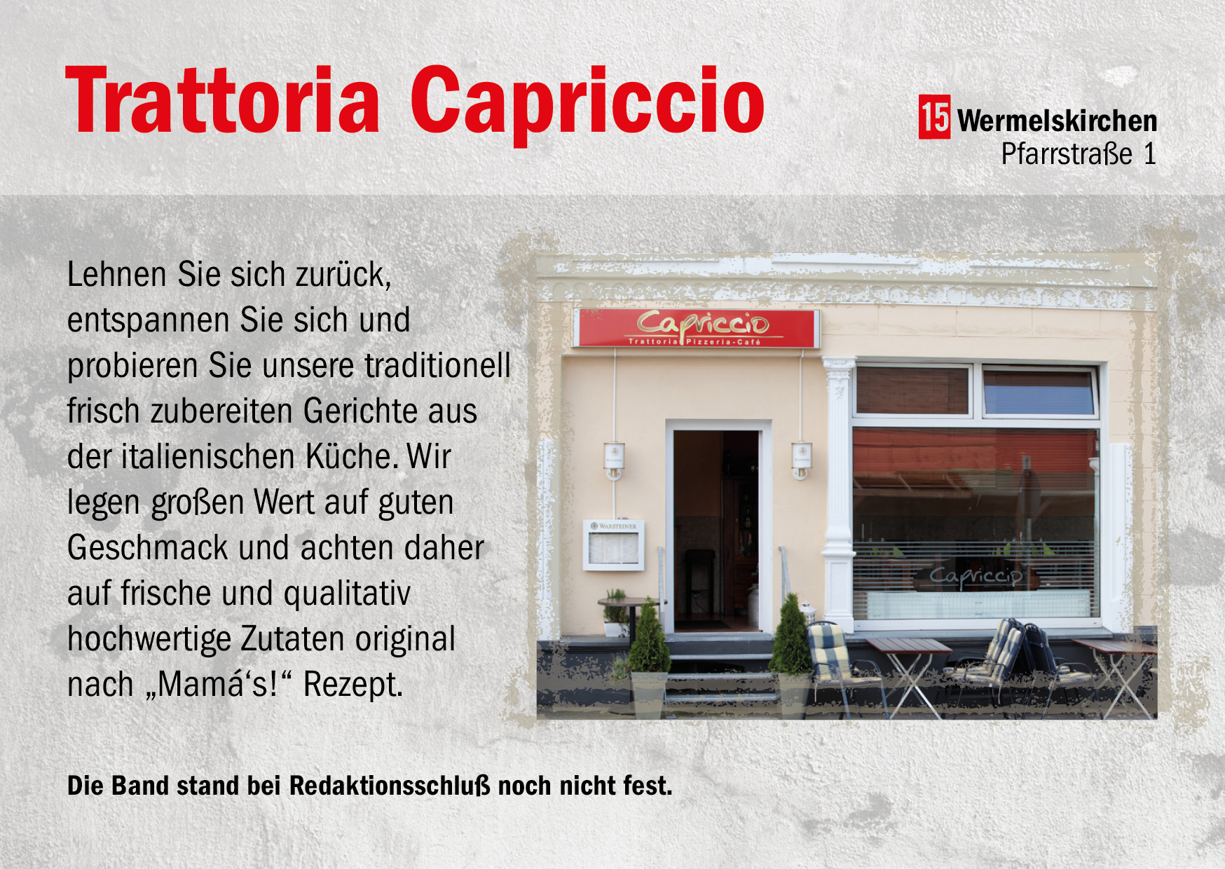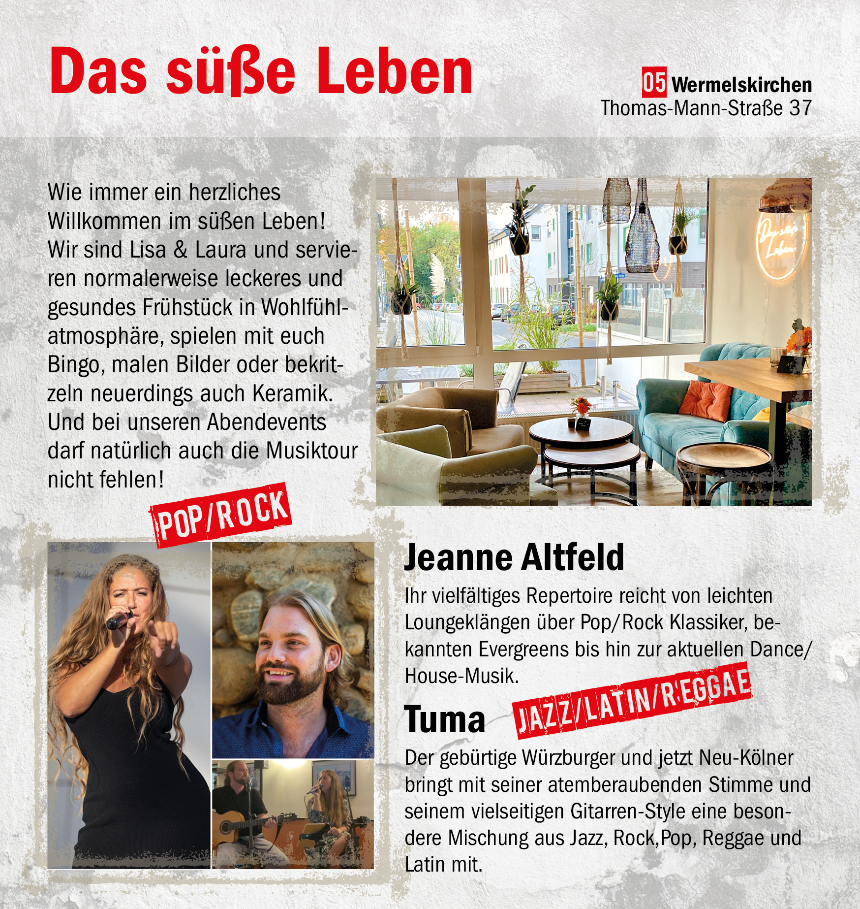 AJZ Bahndamm (Sonic Beat Explosion, Supercobra, Deviltrain), Bistro Katt (Bratsche), Centrale (Virus), CVJM (Mixtape 65), Das süße Leben (Jeanne Altfeld, Tuma), Gaststätte Höller (DJ Nameless), Haus Eifgen (Kaiser Franz & Hofkapelle, Bald Since Birth), JUCA (BarbarasBarBand, Abrisshelden), J & K Sportsbar/Grillbarhaus Delante, Kunstverein (Oh! Rooster), Restaurant Balkan (Party-Colonias 2.0), Restaurant Dimitra (Griechisches Duo), Toskana (WEMusik), Trattoria Capriccio, Dorfkultur (The Hamples, Chum Bucket), Markt 57 (Vom Fass), Zur Post (Nobbi)