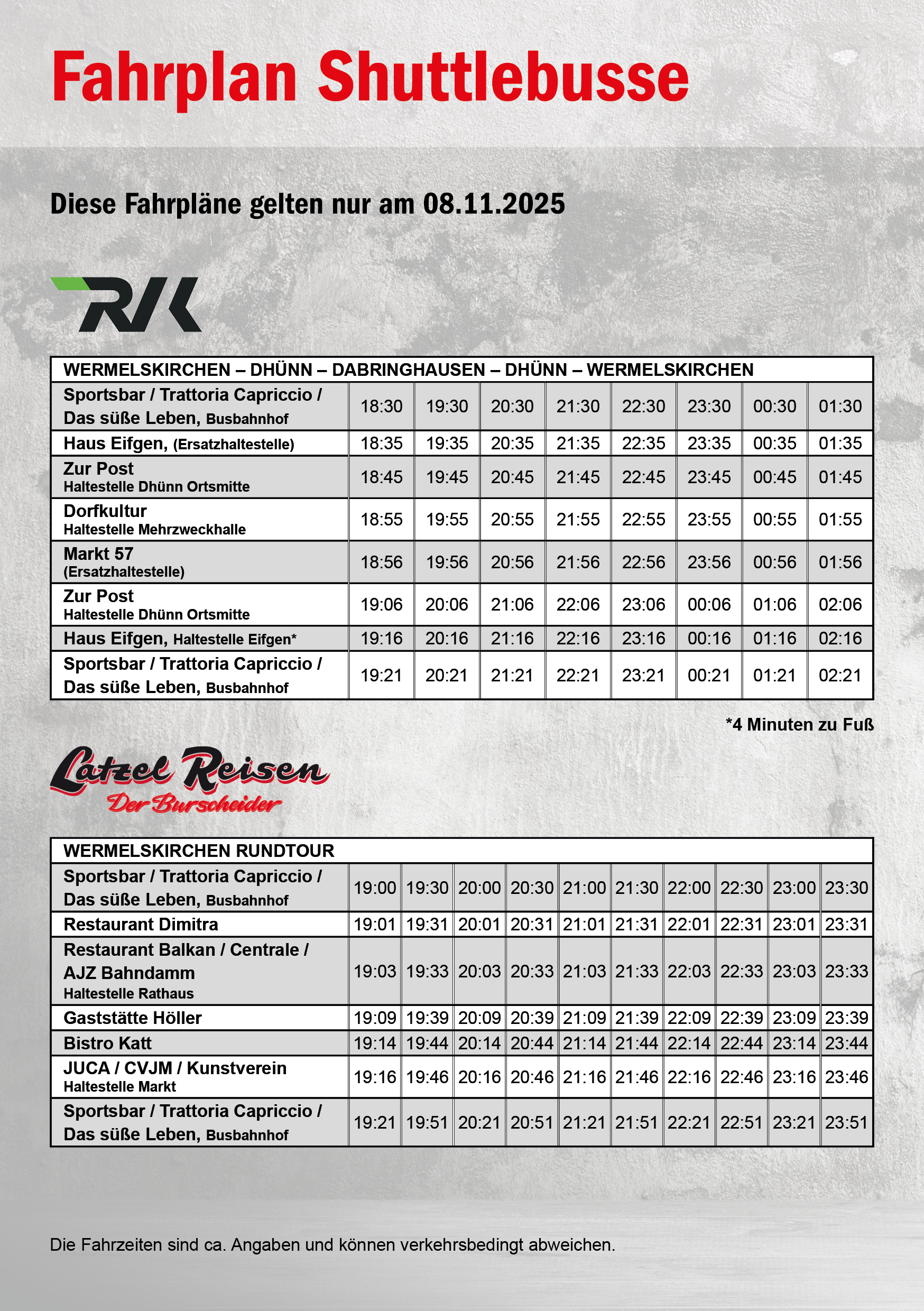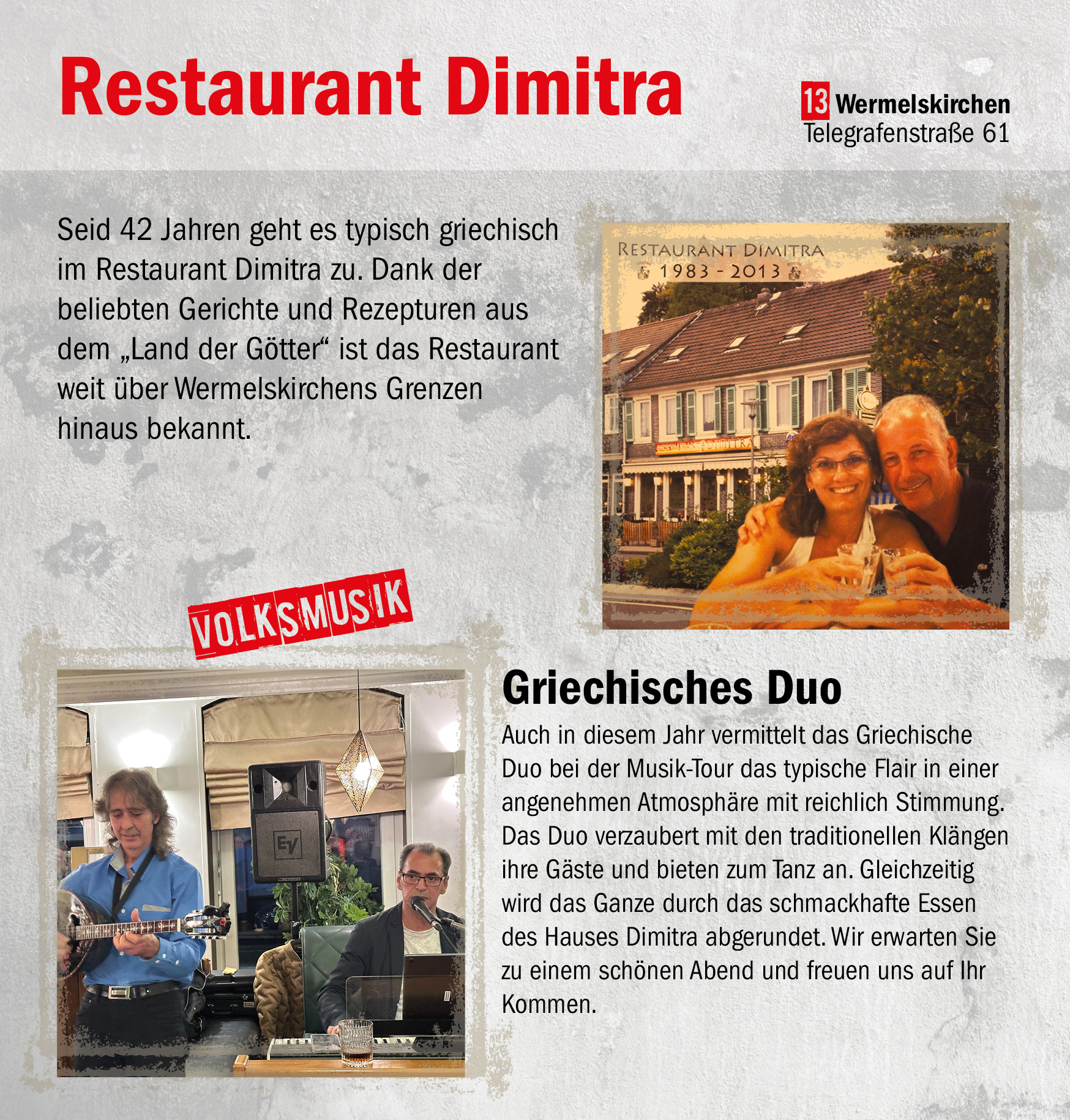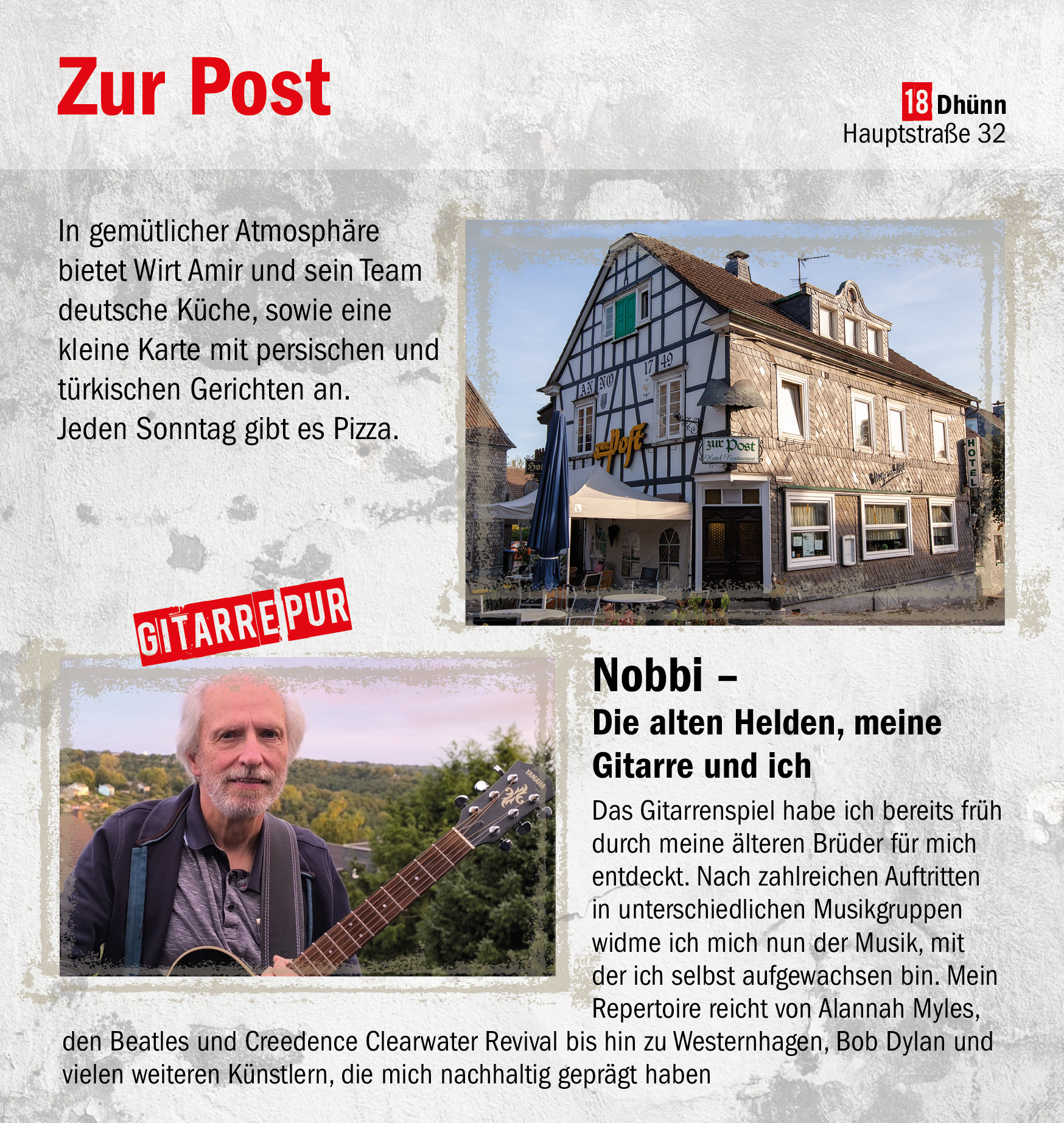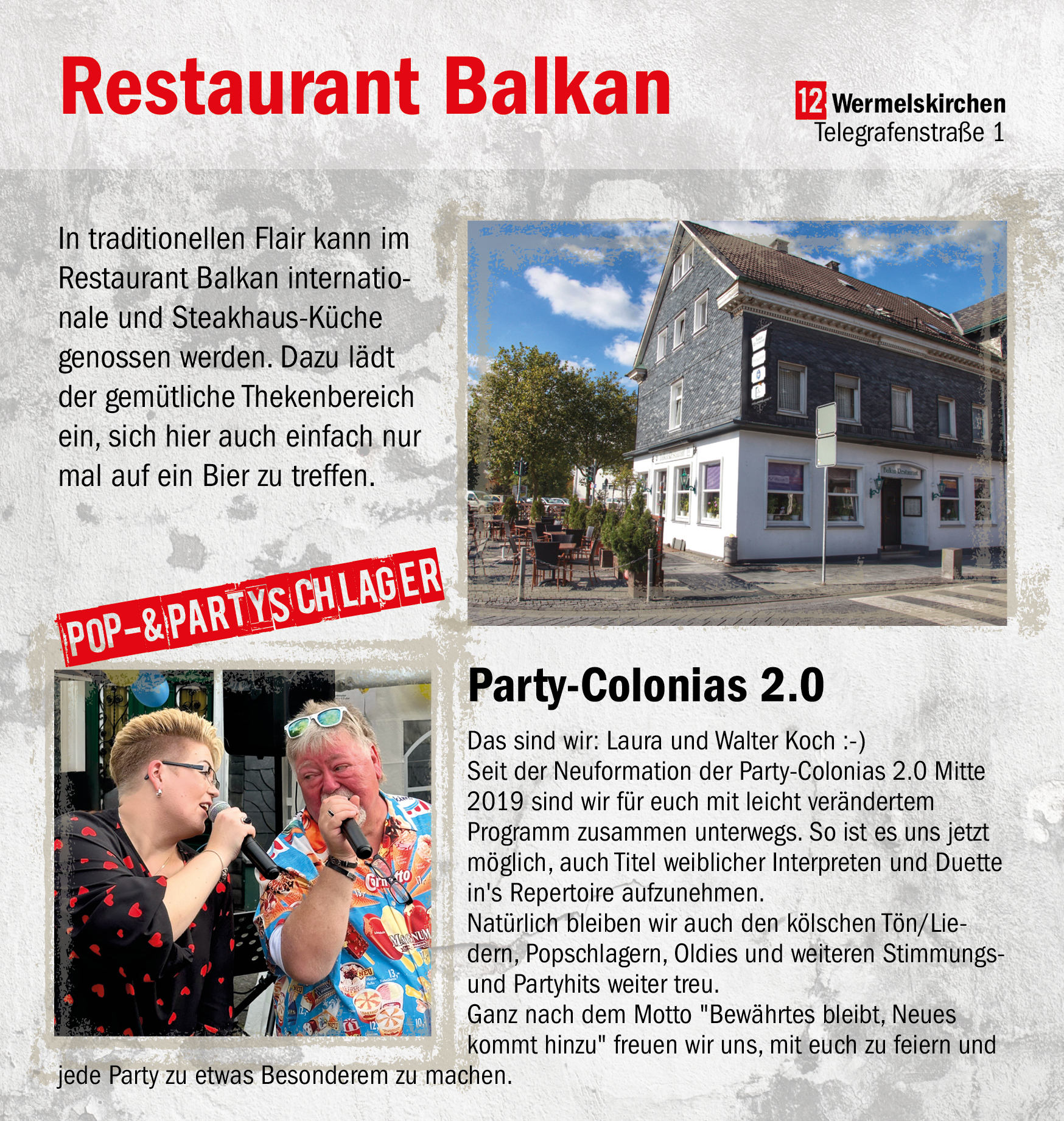 AJZ Bahndamm (Sonic Beat Explosion, Supercobra, Deviltrain), Bistro Katt (Bratsche), Centrale (Virus), CVJM (Mixtape 65), Das süße Leben (Jeanne Altfeld, Tuma), Gaststätte Höller (DJ Nameless), Haus Eifgen (Kaiser Franz & Hofkapelle, Bald Since Birth), JUCA (BarbarasBarBand, Abrisshelden), J & K Sportsbar/Grillbarhaus Delante, Kunstverein (Oh! Rooster), Restaurant Balkan (Party-Colonias 2.0), Restaurant Dimitra (Griechisches Duo), Toskana (WEMusik), Trattoria Capriccio, Dorfkultur (The Hamples, Chum Bucket), Markt 57 (Vom Fass), Zur Post (Nobbi)