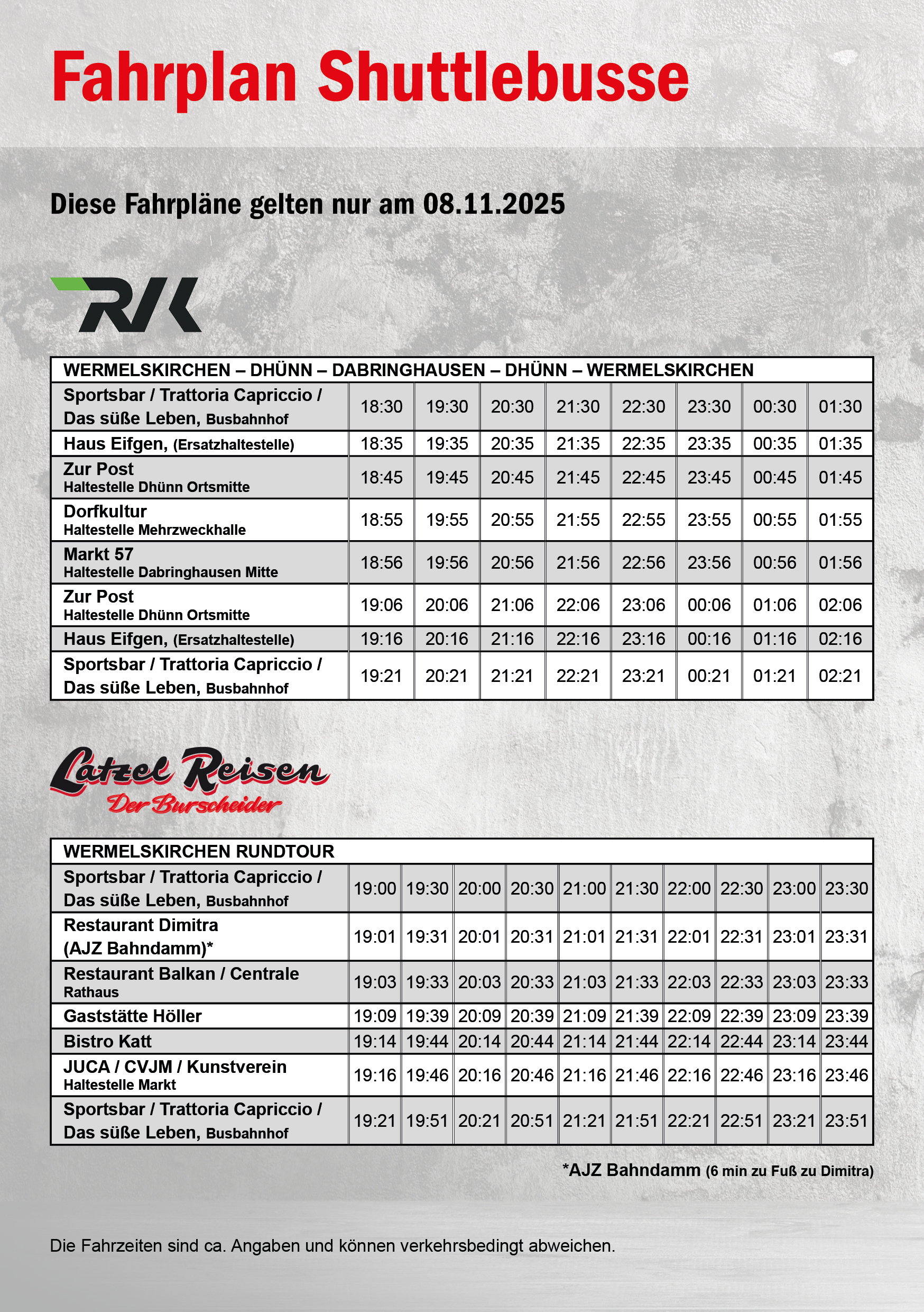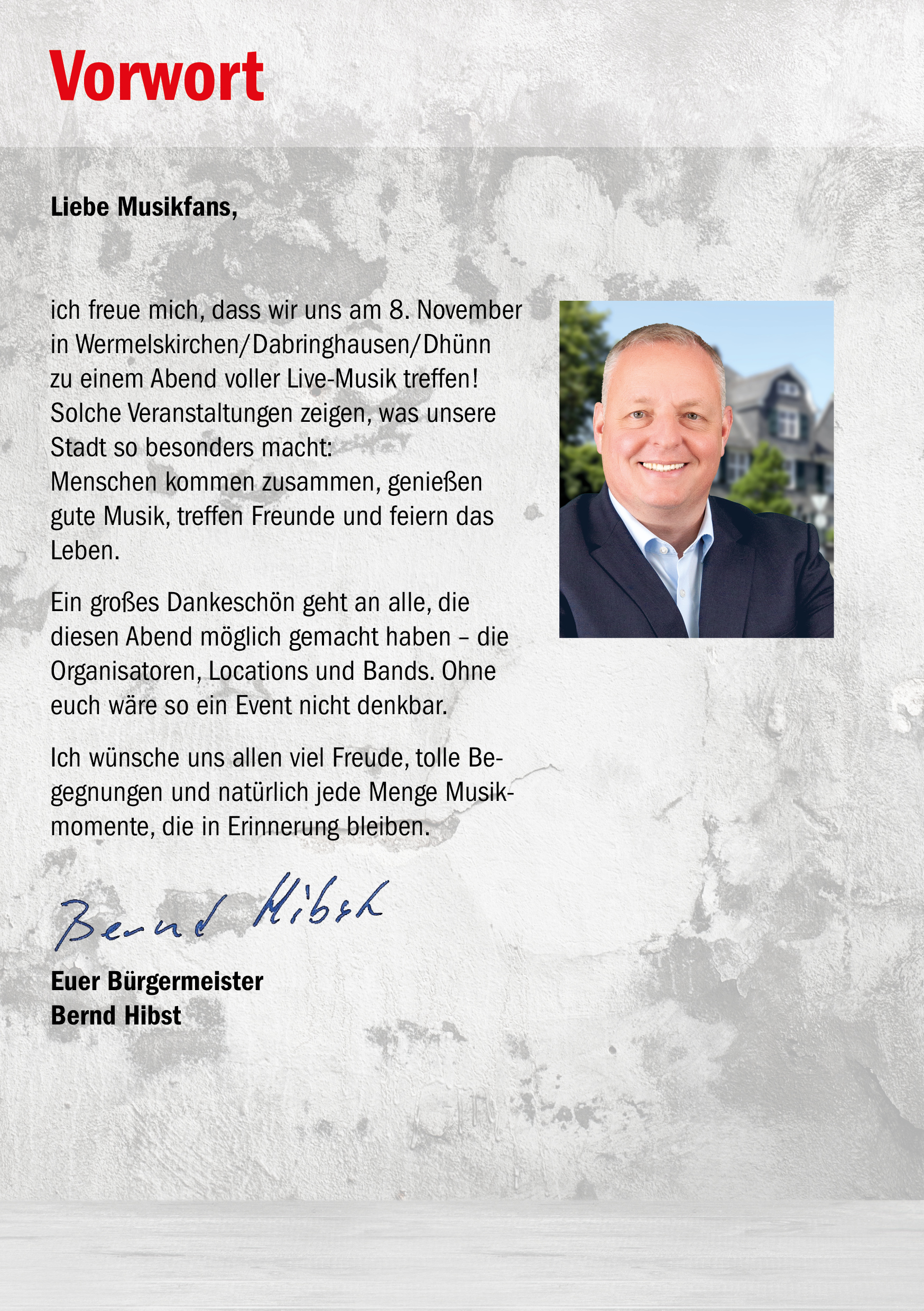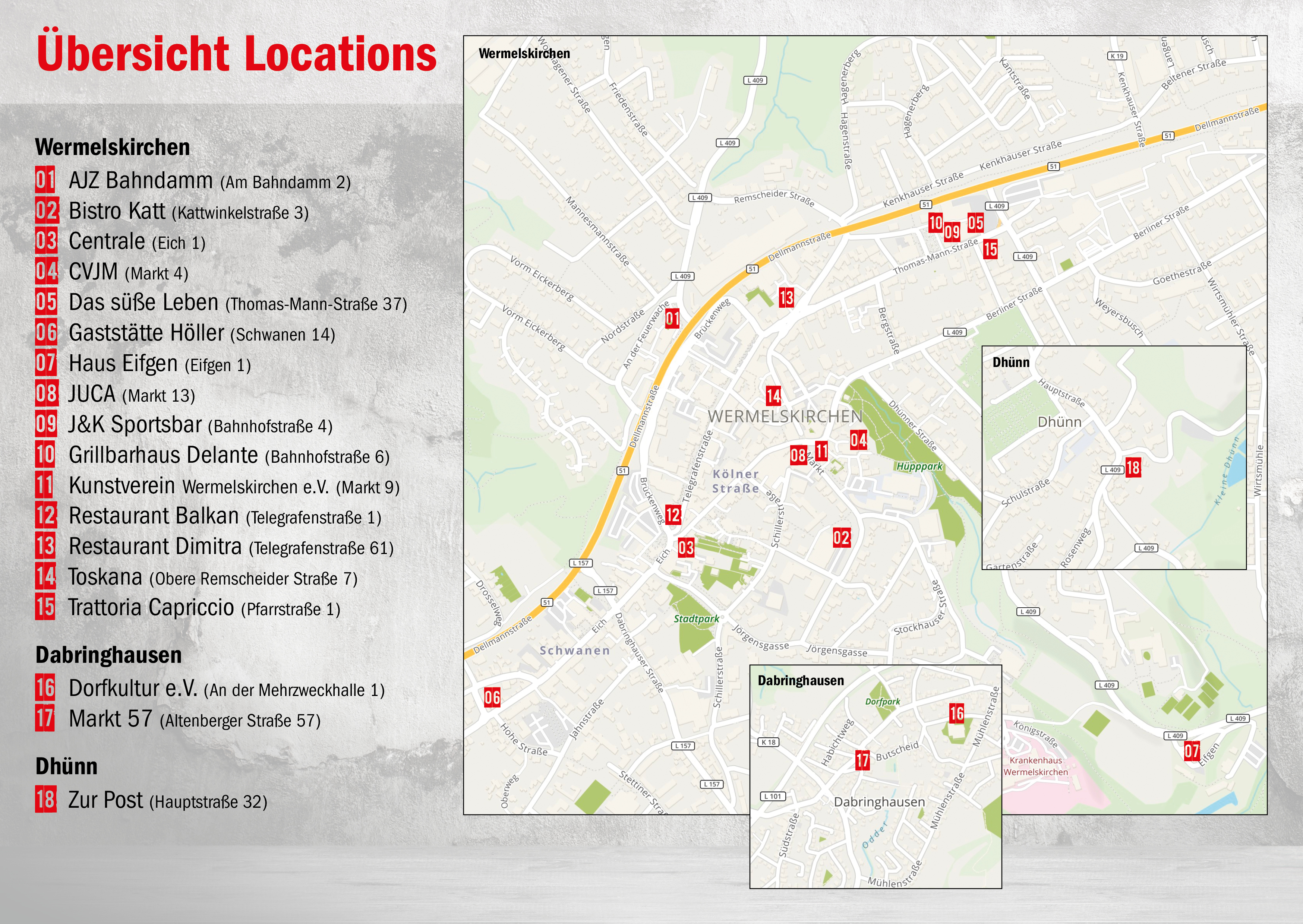 AJZ Bahndamm (Sonic Beat Explosion, Supercobra, Deviltrain), Bistro Katt (Bratsche), Centrale (Virus), CVJM (Mixtape 65), Das süße Leben (Jeanne Altfeld, Tuma), JUCA (BarbarasBarBand, Abrisshelden), Haus Eifgen (Kaiser Franz & Hofkapelle, Bald Since Birth), J & K Sportsbar/Grillbarhaus Delante, Kunstverein (Oh! Rooster), Restaurant Balkan (Party-Colonias 2.0), Restaurant Dimitra (Griechisches Duo), Toskana (WEMusik), Trattoria Capriccio, Dorfkultur (The Hamples, Chum Bucket), Markt 57 ( Vom Fass), Zur Post (Nobbi)